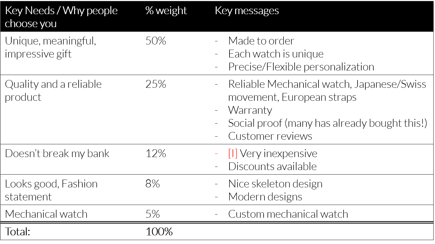 Careful, objective and thorough customer interviews should give you pretty good insights as to what your customers are looking for. Let’s take my brand EONIQ as an example, we make customized watches at around 200USD price point. 1st I’ll put into the table the top 5 needs for one of our persona, from the most important to the least.