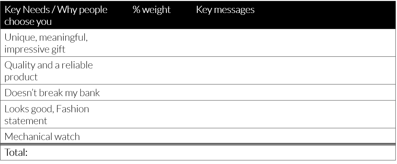 Step 2: Try to give the key needs % weight. At this stage if you realize that the ranking’s a bit off, it’s now time to re-arrange them.